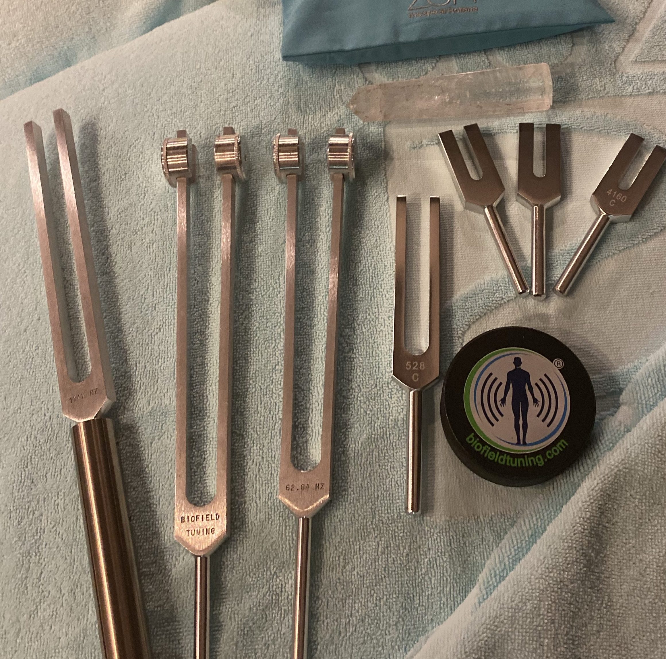 Pure frequency therapy uses specialized tuning forks around and directly on the body, which create a felt, soothing vibration, while also supporting the energetic alignment of the electromagnetic biofield. Resonant frequencies are used, such as the 7th and 8th harmonic of the Schumann frequency (frequency of alpha/theta brainwaves & the Earth’s atmosphere) to entrain with the human energy field, restoring its natural rhythms.